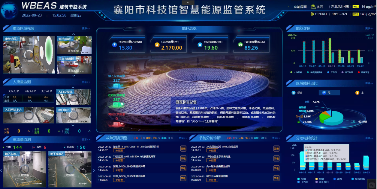 襄陽市科技館新館總建筑面積35268㎡,其中地上建筑面積26468㎡,地下建筑面積8800㎡,展教面積約20000㎡,屬國家特大型科技場館。為響應國家和省節能主管部門有關公共建筑機構節能管理的精神,提高襄陽科技館能源管理信息化水平,經公開招標,引進萬洲電氣WBEAS建筑智能優化節能系統,該項目于2022年3月初開始建設,5月底完成系統上線運行和驗收。