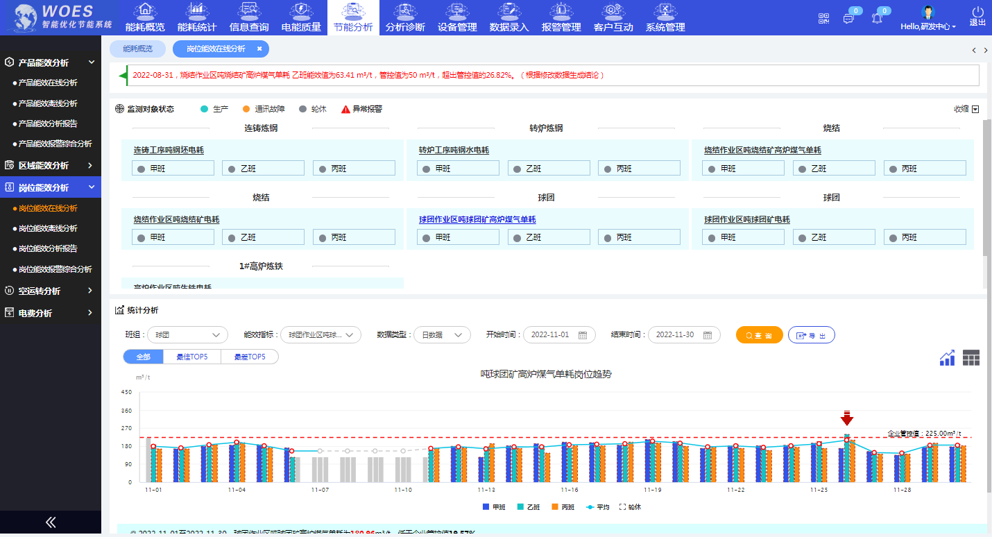 4、班組能效管控考核,提高生產(chǎn)效率、能源使用效率。通過實時查看每月每日每個班組的產(chǎn)量、能耗和單耗情況,系統(tǒng)自動開展能效診斷分析,發(fā)現(xiàn)各生產(chǎn)班組的能耗差異。針對各生產(chǎn)工序(石灰窯、燒結(jié)、球團(tuán)、噴煤、高爐、熱風(fēng)爐、轉(zhuǎn)爐、連鑄、加熱爐、軋鋼)規(guī)分別建立班組能效評價考核體系,范員工操作,提高員工節(jié)能意識,實現(xiàn)年節(jié)約收益120萬元。