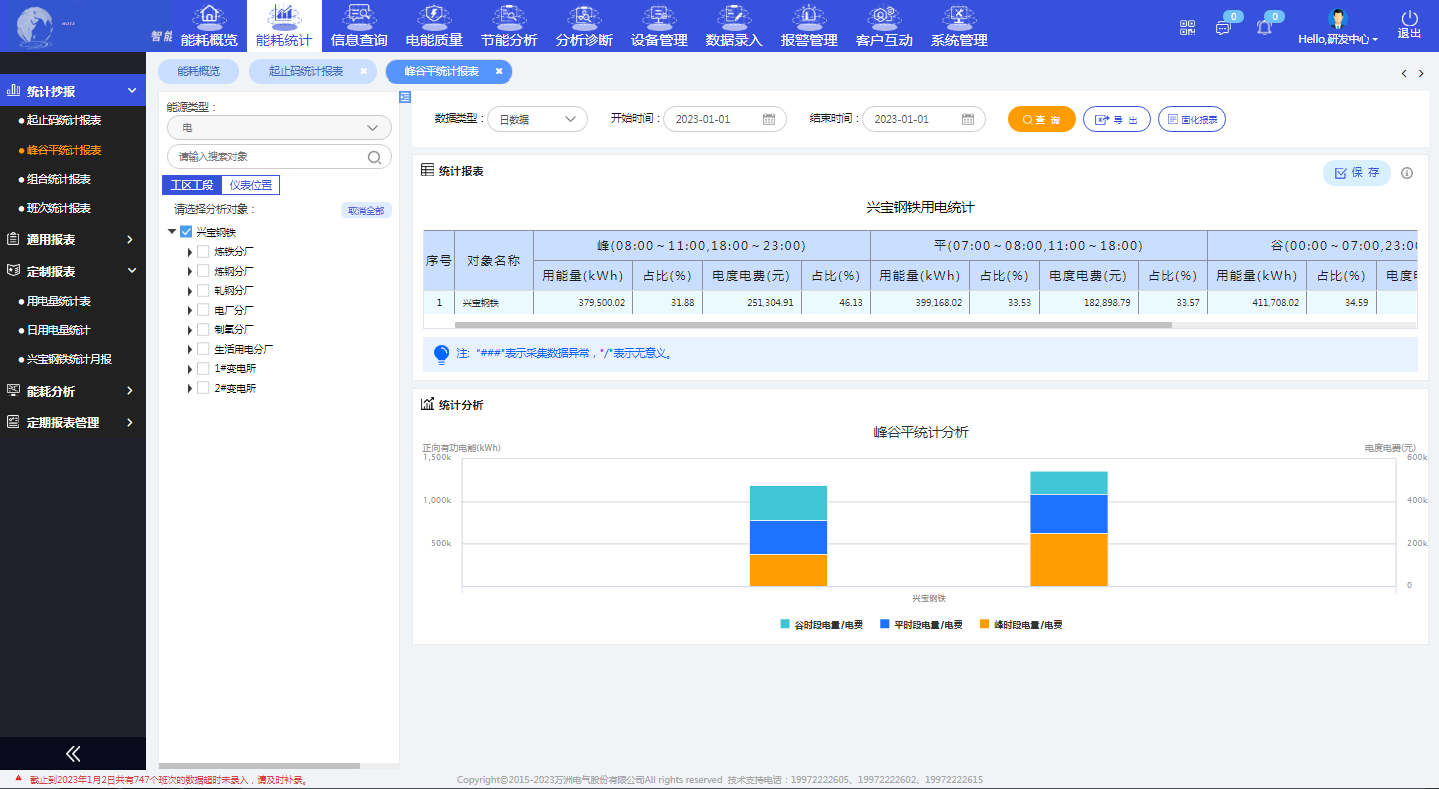 2、提升產(chǎn)品單耗分析能力。通過各種趨勢圖、曲線圖等統(tǒng)計、分析功能對鐵水、鋼坯、鍛件、鋼管進(jìn)行單耗分析(將當(dāng)前能源消耗的指標(biāo)數(shù)據(jù)與企業(yè)管控值、行業(yè)先進(jìn)值進(jìn)行對標(biāo)),根據(jù)不同時間(白班和夜班、夏季和冬季)的單耗可以分析出區(qū)域能耗異常的時間,從而查找原因制定措施針對性解決。