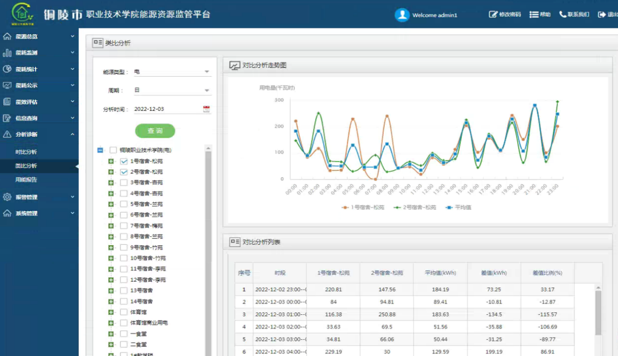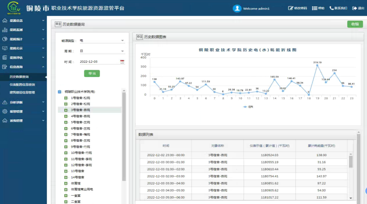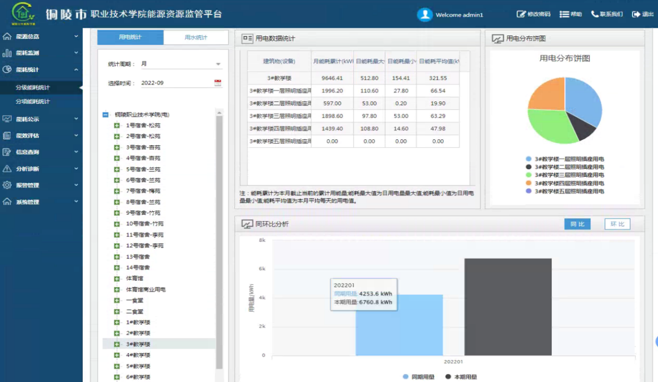 2、優(yōu)化宿舍用電管理措施,減少能源浪費。學校宿舍樓一共有14棟,通過歷史數據查詢功能發(fā)現(xiàn)每天晚上除5號宿舍和9號宿舍在23點之后照明用電量有明顯的下降外,其他的宿舍樓照明用電持續(xù)運行到凌晨1點才有下降的趨勢,并未進行管控,學校發(fā)現(xiàn)該問題后,通過對宿舍樓進行統(tǒng)一照明用電管理,優(yōu)化宿舍用電管理措施,避免能源浪費,每年學校宿舍樓節(jié)約3.29萬元。